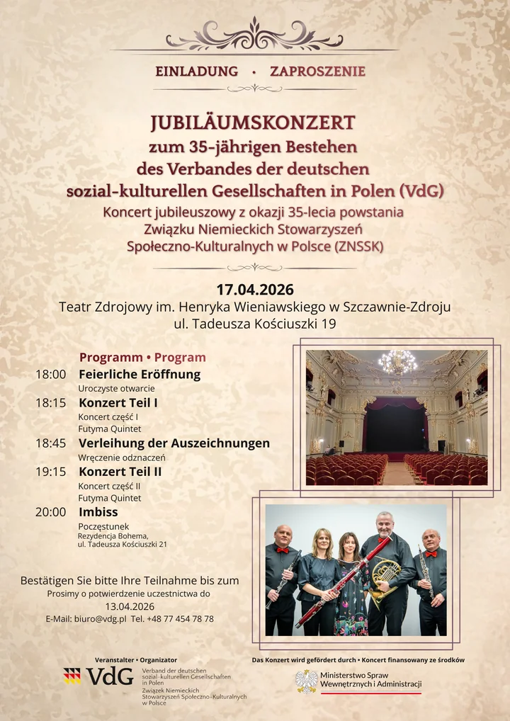 W Teatrze Zdrojowym im. Henryka Wieniawskiego zaplanowano koncert jubileuszowy z okazji 35-lecia Związku Niemieckich Stowarzyszeń Społeczno-Kulturalnych w Polsce (VdG/ZNSSK).
